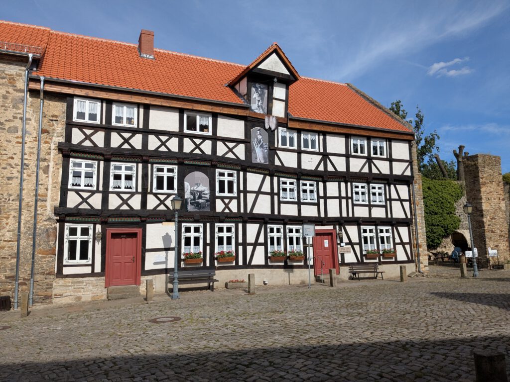 Neben Eggen, Häckslern und Pflug, mit denen es damals auf den Acker für die Bewirtschaftung ging, gibt es auch Strohschneider, Waage und noch vieles mehr auf dem Burghof und dem Burgverbinder zu sehen. In 2025 wurde eine alte Grenzsäule gesetzt.
