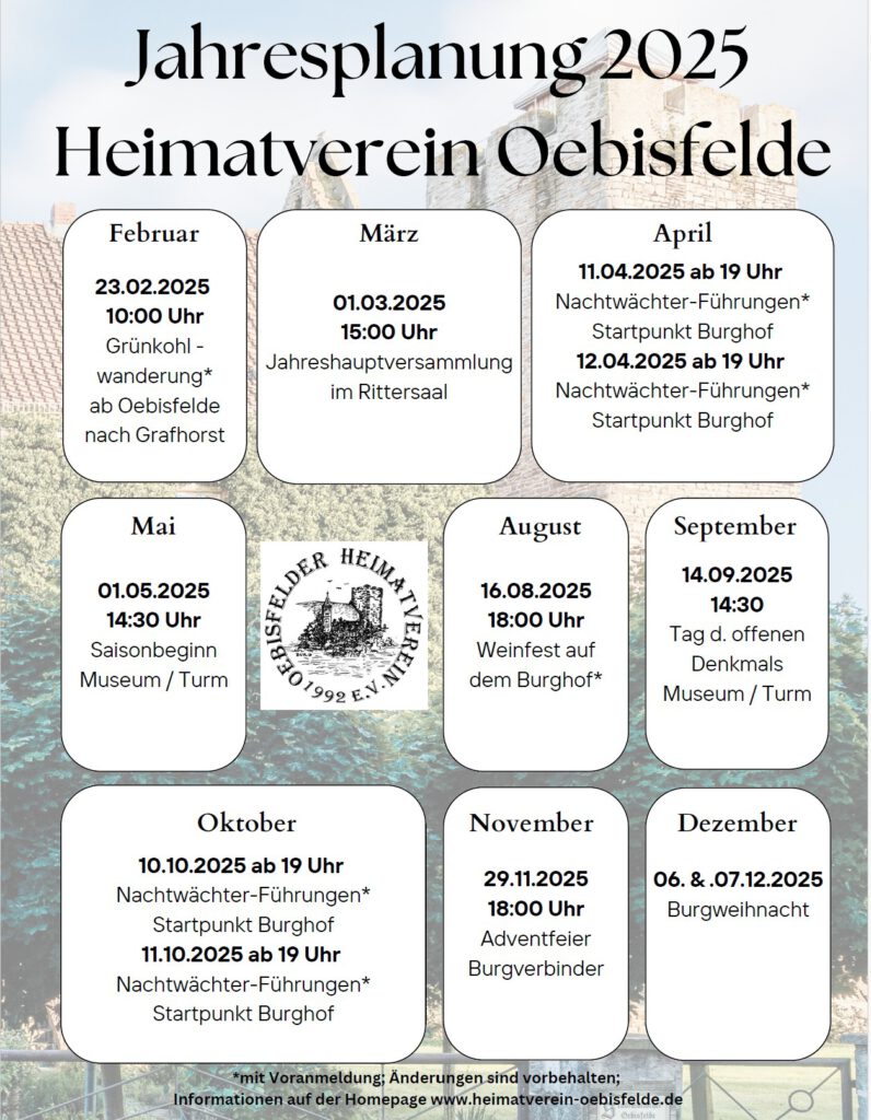 Wegen der anstehenden Baumaßnahmen am Gebäude des Burg- und Heimatmuseums verschiebt sich der Saisonbeginn beim Museum in den Juni hinein. Ein genauer Termin der Öffnung wird noch bekanntgegeben. Der Burgturm hingegen ist ab dem 1. Mai bis zum 3. Oktober wieder jeden Sonntag und Feiertag von 14.30 – 17.30 Uhrfür Besucher geöffnet.